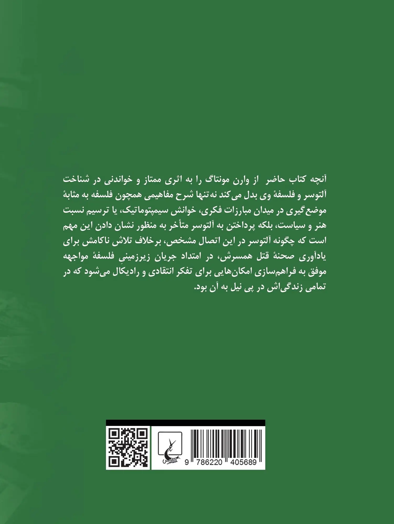 آنچه کتاب حاضر از وارن مونتاگ را به اثری ممتاز و خواندنی در شناخت آلتوسر و فلسفۀ وی بدل میکند نه تنها شرح مفاهیمی همچون فلسفه به مثابۀ موضعگیری در میدان مبارزات فکری، خوانش سیمپتوماتیک، یا ترسیم نسبت هنر و سیاست، بلکه پرداختن به آلتوسر متأخر به منظور نشان دادن این مهم است که چگونه آلتوسر در این اتصال مشخص، برخلاف تلاش ناکامش برای یادآوری صحنۀ قتل همسرش، در امتداد جریان زیرزمینی فلسفۀ مواجهه موفق به فراهمسازی امکانهایی برای تفکر انتقادی و رادیکال میشود که در تمامی زندگیاش در پی نیل به آن بود.