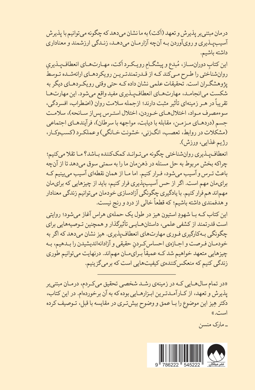 این کتابِ دورانسـاز، مُبدع و پیشگـامِ رویـکـرد اَکت، مهـارتهـای انعطافپـذیریِ روانشناختی را طـرح مـیکند کـه از قـدرتمندتـریـن رویکردهـای ارائهشـده تـوسط پژوهشگـران است. تحقیقات علمی نشان داده کـه حتی وقتی رویکـردهـای دیگر به شکست میانجامـد، مهارتهـای انعطافپـذیری مفید واقع میشود. این مهارتهـا تقریباً در هـر زمینهای تأثیر مثبت دارند؛ ازجمله سلامت روان (اضطراب، افسردگی، سوءمصرف مـواد، اختلالهـای خـوردن، اختلال استـرس پساز سـانحه)، سلامـت جسم (دردهـای مـزمـن، مقابله با دیابت، مواجهه با سرطان)، فرآیندهـای اجتماعی (مشکلات در روابط، تعصب، انگزنی، خشونت خـانگی) و عملکـرد (کسبوکـار، رژیم غذایی، ورزش).